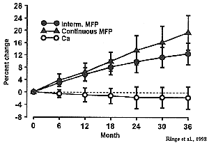 令人关注的是腰椎BMD的改变,由图2可以看出,经过3年治疗,A组(间歇MFP)该值提高13%,B组(连续MFP)提高20%,而在单纯补充钙剂的C组,腰椎BMD则降低了1.6%。MFP治疗组与钙剂对照组的差异显著,并且B组的20%的增加值也明显高于A组的13%。