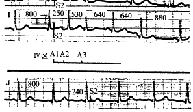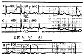 图5 窦房结对房早刺激的四区反应 Ⅰ区反应即窦房结周干扰区:其特点为S2刺激引起代偿期完全,使A1A3间期=2A1A1间期(图B、C两条)。Ⅱ区反应即窦房结内干扰区:其特点为S2刺激引起不全代偿期,使A1A3间期<2A1A1间期(图D、E两条)。Ⅲ区反应即窦房结不应区:S2刺激进一步提前时,其引起的房早成为插入性,使A1A3间期=A1A1间期(图F、G两条)。Ⅳ区反应即窦房结折返区:S2刺激引起窦房折返,使A1A3间期1A1间期(图H、I两条)