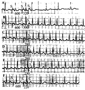 图4 窦房折返性心动过速的终止 心动过速发作后,应用食管心房调搏S1S1刺激终止,A条中5个S1刺激连发,S1S1间期550 ms,相当于110 bpm的刺激。B条中4个S1刺激连发,S1S1的间期400 ms,相当于150 bpm的刺激。S1刺激发放后,心动过速终止,恢复窦性心律
