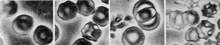 图1~4 左心辅助循环和体外循环前、后血细胞布氏显微镜照片(×8 000) 图1 左心辅助循环前红细胞、白细胞形态正常,白细胞无活化 图2 左心辅助循环后红细胞、白细胞形态正常,白细胞无活化 图3 体外循环前红细胞、白细胞形态正常,白细胞无活化 图4 体外循环后红细胞畸形,白细胞活化