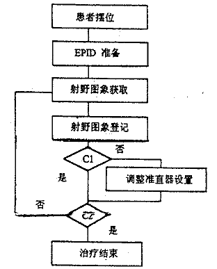 图6 自动跟踪放疗流程图。C1 是判断条件"摆位误差可以接受吗?"。 C2 是判断条件"所需机器跳数是否已全部照射?"。