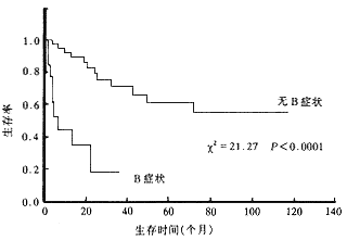 由图1显示,治疗3年后生存率趋向平台。B症状对生存率的影响见图2,2个组生存率差异有非常显著意义。
