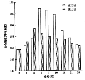 注:①加力后双侧灰度值均以(实际灰度值+变化量)× 2计算,其结果对统计学分析无影响;②P为采用自身对照t检验的分析结果;③采用方差分析,张力区加力第3、5、7、10、14天与0天,第3天与第5天,第10天与第14天以及压力区加力第3、5、7天与0天,第1天与第3天之间,差异均有显著性(P<0.05)