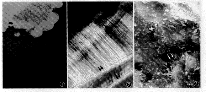 用扫描电镜观察下颌乳尖牙表面结构,根面大部分区域为牙本质覆盖,可见分布较为均匀的牙本质小管开口,也有2~3个牙本质小管开口相融合的现象。在牙根表面仅发现3处直径在50~100 μm的牙骨质小岛,小岛中的牙骨质有圆形或卵圆形光滑的吸收凹陷,每个光滑凹面都有清楚的边缘,其表面散在分布有直径约为1 μm的小孔。靠近冠1/3的根面,有大小不等的细菌侵入牙本质小管(图3)。根表面有散在的牙本质吸收区。