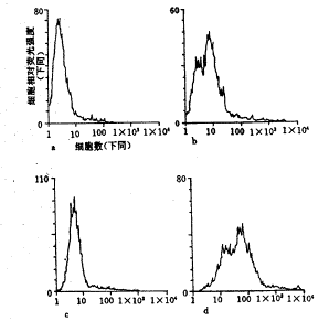 FCM观察细胞表面主要组织相容复合物(major histocompatibility complex,MHC)Ⅰ、Ⅱ类分子表达的变化[2]。2×106细胞,胰酶消化后PBS洗2次,去上清后加入100 μl鼠抗人MHCⅠ类或Ⅱ类Ⅰ抗(由上海市免疫学研究所提供),冰浴30 min(每5 min摇匀1次),再用大量PBS洗2次,离心(1500 r/min,5 min),去上清加入荧光素异硫氰酸盐(fluoroscein isothiocyanate,FITC)标记的绵羊抗鼠IgGⅡ抗(购自华美生物工程公司)100 μl,冰浴30 min,每5 min摇匀1次,再用大量PBS洗2次,加300 μl PBS后上机。