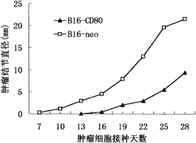 观察小鼠体内肿瘤生长情况,发现B16CD80组小鼠成瘤潜伏期和荷瘤小鼠存活期都显著延长(见表1),肿瘤结节的生长速度显著减慢(见图2),说明CD80基因转染的肿瘤细胞体内生长能力明显降低。