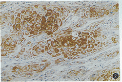 2.口腔鳞癌中nm23-H1蛋白的表达:75例口腔鳞癌中低染48例,高染27例。其中染色(-)18例,(+)21例,(++)9例,(+++)19例,(++++)8例。nm23-H1的阳性信号主要位于肿瘤细胞的胞浆中,且肿瘤细胞分化越好,染色也越好(图2,3)。