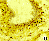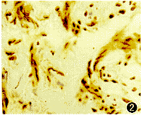 2.PCNA结果(表1):Ⅰ组,PCNA阳性细胞中,成纤维细胞、 血管内皮细胞及上皮细胞均有不同程度的染色,阳性细胞呈随机分布(图1,2)。在成纤维细胞,血管内皮细胞增殖明显的标本中PCNA阳性率较高。对不同年龄、性别、病程、翼状胬肉分级及分型等进一步的统计学分析比较,结果表明 PCNA阳性率与性别、病程、翼状胬肉分级等无关,而与年龄及分型有关(表1)。