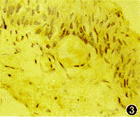 2.抑制翼状胬肉内细胞PCNA表达有助于减少翼状胬肉术后复发:近年文献报道,抗代谢药(丝裂霉素C)局部应用可明显抑制翼状胬肉术后的复发,可使单纯翼状胬肉切除及巩膜暴露或自体结膜瓣移植的复发率明显降低[6,7]。对于丝裂霉素等抗代谢药的治疗作用机制推测认为,是通过抑制细胞增殖从而减少S期细胞及减轻细胞合成等而起作用,但尚无病理学研究的证实。本研究结果表明,术前局部应用抗代谢药高三尖杉酯碱加氟美松,可使翼状胬肉细胞PCNA表达明显减少,说明S期细胞明显减少,翼状胬肉内的细胞增殖及合成均受到抑制, 这与对体外培养的成纤维细胞具有抑制作用的结果一致[8]。本研究发现,应用高三尖杉酯碱加氟美松后翼状胬肉的复发率明显降低,与病理结果一致。而氟美松虽然对于体外培养的成纤维细胞[8]或小梁细胞[5]具有抑制作用,但在体内对于翼状胬肉细胞的增殖抑制作用并不明显。同时表明体外实验与体内实验结果仍存在一定的差异,二者结合可使结果更为确切完整。
