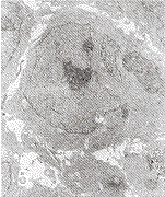 三、动物分组及给药 肾包膜下移植后第3天开始给药,18只裸小鼠分成3组:每组6只,1.高剂量组HE,10 mg/kg体重。2.低剂量组HE,5 mg/kg体重。3.阴性对照组,生理盐水0.4 ml/只裸小鼠。经腹腔内注射,1次/天,连续16天。停药后第2天处死裸小鼠,用测微器测肾包膜下的肿瘤小块的长径和横径,所得数据及裸鼠体重输入电脑软件得出抑瘤率及t值。肿瘤小块分别做石蜡切片,苏木素伊红染色,光镜观察,有丝分裂计数和超薄切片铀铅染色,超微结构观察。
