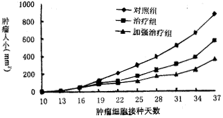 三、DC激活的CTL抑制移植瘤生长 接种后的第37天对照组、治疗组及加强治疗组肿瘤大小分别为873 mm2±19 mm2、569 mm2±17 mm2、361 mm2±26 mm2。生长曲线见附图。与对照组相比,治疗组及加强治疗组移植瘤生长均受到不同程度抑制(P<0.05,P<0.01)。在两治疗组中,加强治疗组移植瘤生长受到抑制更明显(P<0.05)。