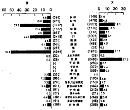 在1993~1994年间,上海市区发生恶性肿瘤新病例35,000多人。男性中肺癌居第一位(标化发病率50.9/10万),以后依次为胃(39.2)、肝(26.5)、结肠(12.4)和食管(10.0)。女性前五位恶性肿瘤依次为乳腺(27.5/10万)、胃(19.1)、肺(17.7)、结肠(11.3)和肝(9.4)(见图1)。