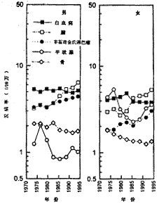 造血系统和其他部位主要肿瘤的发病趋势。白血病变化不大,男性标化发病率维持在5/10万,女性4/10万左右。骨肿瘤略有下降。80年代以后脑和神经系统肿瘤(包括中枢神经系统良性肿瘤)持续上升,成为男、女性居第八位的肿瘤。女性甲状腺癌为男性的3倍多,70年代中期至80年代早期有较大幅度下降,90年代初又有上升趋势。非霍奇金淋巴瘤呈上升趋势,女性上升速度大于男性(见图5)。