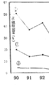 3.4 10年监测期间(1990~1999年)的病情动态(图1) 这个期间的病情动态是80年代变化趋势的继续,总的方向是持续下降。情形可概略地区别为四种:①1990年开始时检出率在10%以下,观测期间基本未见波动,稳定在2%~3%之间,一种若隐若现状态。不论从医学研究角度,还是从危害、后果角度,皆可认为达到了控制水平,除非有特殊情况发生,应当是可以放心的了。这些病区都处在大骨节病病带的太平洋一侧,其中许多是历史上的重病区;如吉林的蛟河、辽宁的桓仁、黑龙江的尚志,当年都是屡见于文献的“发祥地”级的严重地区。②90年代开始检出率在10%~30%的病区,在稍有波动中一路下降,到达1996年即稳定在10%以下,达到基本控制的水平。这一类病区比前段中提到的地方更靠近内陆,更比较高寒。它们的前途,不好说一定会怎样,鉴于榆林、青海等地的先例,再度恶化“死灰复燃”的可能不容忽略。参考信息是,1991~1992年和1994~1995年度都曾有过可以觉察的波动。③检出率大于30%的病区,1990年平均为50%,相当严重;这一类的病情,监测中陟然下降,直到1997年达到10%以下。但请注意1992年确是曾经有过一次明显的反弹。此类病区分布在病带深处的高寒地域,是大骨节病高危险地区,应给以特别的注意;近年来若干新的重病区和加重了病情的旧病区,都出现在类似环境条件下。中国大骨节病的最后“堡垒”,就在这里。④上述三种情况,是全国大骨节病10年监测中看到的主流,但并不是全部。大局趋向稳定,然而并不是可以“马放南山”。观察期间,看到了陕北榆林有新的活跃重病区出现,看到了青海兴海县等病区病情明显加重。榆林的新病村也许并非严格意义上的新病区,然而至少是1994年以前未曾引起当地专业人员的注意;青海的病情加重应当算作与全国其它病区当今现况比较中的发现,在大流行的年代,这完全是不足为奇的。榆林、青海现象是个别的,然而很有意义。“警钟常鸣”的价值不可忽视。大骨节病是致残性疾病,一旦残疾了,对于任何人都是不幸。一个村病情严重,等于同时宣布贫困的难以摆脱。榆林、青海现象足以为“天下太平论者戒”,而且提示西北、甚至西南高原上,有可能演变出一个或者一片严重的大骨节病多发地带。