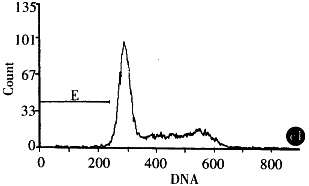 2.3.3 Ad-AS c-myc对SGC7901细胞的凋亡诱导作用 ①DNA梯度降解试验:提取细胞染色体DNA进行琼脂糖凝胶电泳结果发现,SGC7901细胞经A d-AS c-myc处理2后染色体DNA发生断裂,2,4,6d电泳可见180bp~200 bp 不同倍体梯状DNA(DNA Ladder),DNA Ladder的出现有一定的时间效应,以6d时明显 ,Ad-LacZ处理组染色体DNA未见明显的DNA Ladder. ②细胞凋亡原位末端标记:细胞发生 凋亡时,染色体DNA在核小体之间发生断裂,形成以核小体为单位的不同长度的DNA片断,同 时产生多个3-OH末端,使用末端转移酶可将标记的dUTP连接在DNA片段的3-OH末端上,显 色显示凋亡细胞,经Ad-AS c-myc处理的SGC7901细胞Tunel试验可见明显的细胞凋亡现象. ③流式细胞仪检测:将SGC7901细胞分为Ad-AS c-myc,Ad-LacZ 及细胞对照组, 以MOI 100感染细胞,不同时间点收获细胞,PI染色处理后于FCM上检测,结果显示Ad-AS c-myc处理组48h内细胞周期无明显改变,4,6d可见S、G2M期阻滞. 2 d开始出现凋亡,凋亡高峰在6d,2,4,6d凋亡率分别为1.6%,2.9%,50 .7%(图1).