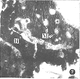 图7种植细胞的人工骨中新骨形成:新形成的骨中可见骨髓腔样腔隙(M)HE×400