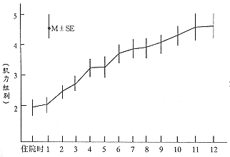 2.4 病情好转与某些体征关系 腰椎间盘突出症的主要症状和体征已有详细介绍,我们系统观察了直腿抬高试验(Laseguesign)及足拇趾背伸肌力对侧比较两个体征的变化,以作为病情好转动态变化的简易指标。共观察16例(男10,女6),结果见图1、2。