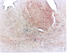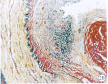 2.3 血管组织切片显微镜下观察 (1)对照组:内膜极度增厚,几乎堵塞管腔,可见附壁血栓。新生内膜主要由血管平滑肌细胞、炎性细胞、纤维母细胞和大量细胞间质构成(图2A,B;图见插页)。(2)实验组:内膜增生较对照组明显减轻,新生内膜主要成分为血管平滑肌细胞及胞外基质,远端流出道吻合口内膜增生又较近端流入道明显减轻。移植的静脉片段中膜明显增厚,且有发达的内弹力膜,呈动脉样结构改变,少量的平滑肌细胞呈泡沫样改变,未见脂纹和胆固醇结晶(图2C,D,图3A,B;图见插页)。