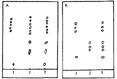 3.2 远志的鉴别:取本品 1 g,研成粉末后,加入 5 mL 甲醇溶解,作为供试品溶液;另取远志对照药材 1 g,同法制成对照药材溶液,照薄层色谱法(中华人民共和国药典1995 版附录35页)试验,吸取上述2种溶液 5~10 μL,分别点于同一硅胶 G 板上,以正丁醇-醋酸-水(5∶1∶4)为展开剂,展开,取出,晾干,喷 1% 香草醛硫酸溶液,110 ℃烘 5 min,日光下检视,供试品色谱中,在与对照药材色谱相应的位置上显相同的3个紫色斑点。如图1-B。