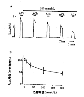图1显示了二帧对照和ACh灌流实验时的情况。每次ACh的灌流时间为30 s,若恢复的时间为30 s时(图1A),则不能允许脱敏完全恢复,因而继之灌流的IK,ACh峰值比第一个要小。然而,二次灌流的间隔时间为3 min时(图1B),则可使IK,ACh的峰值完全恢复。因而我们观察乙醇的作用时,采用的是间隔3 min依次灌注ACh的实验方法。