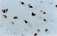 图1 p16蛋白表达在Ⅰ级软骨肉瘤,并示p16蛋白阳性表达主要见于肿瘤细胞胞浆,少数见于细胞核S-P法×200
