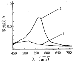 Fig.1 Absorption curve of reagent bla nk(1) and 12 μg Cu2+ color reaction system (2)