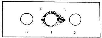 1.3 中性粒细胞趋化功能检查 采用琼脂糖玻板法[2]:①用1640液配制琼脂糖溶液,含10%灭活AB血清,倾注在玻板上,待凝后,分组打孔,每组为3个呈直线排列的圆孔,孔的直径和孔间距离为2.5 mm。②于三孔一组的中间孔中加入5 μl白细胞悬液(5×107/ml),在一侧孔中加入大肠杆菌24 h培养过滤液5 μl作为趋化因子。另一侧孔中加入5 μl的1640液作为对照。③将此琼脂糖玻板在饱和湿度和5%CO2气体的37℃温箱中温育4 h。取出后用甲醇甲醛固定,去除琼脂糖凝胶,用Wright染色,光镜下测量细胞从孔缘向两侧孔移动的距离(图1)。