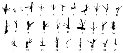 1.1 材料来源:29种材料均为作者野外采集标本时收集而得,各标本都由作者进行了学名鉴定。它们是:1)乌泡子:Rubus parkeri Hance,2)光叶高梁泡:R. lambertianus Ser. var. glaber Hemsl.,3)弓茎莓:R. flosculosus Focke,4)拟复盆子:R. idaeopsis Focke, 5)白叶莓:R. innominatus S. Moore,6)无腺白叶莓:R. innominatus S. Moore var. kuntzeanus (Hemsl.) Bailey,7)红泡刺藤:R. niveus Thunb.,8)陕西悬钩子:R. piluliferus Focke,9)按叶悬钩子R. eucalyptus Focke,10)库叶悬钩子R. sachalinensis Lévl.,11)紫色悬钩子R. irritans Focke,12)菰帽悬钩子R. pileatus Focke,13)多腺悬钩子R. phoenicolasius Maxim.,14)茅莓R. parvifolius L.,15)喜阴悬钩子R. mesogaeus Focke,16)密刺悬钩子R. subtibetanus Hand.-Mazz.,17)腺毛密刺悬钩子R. subtibetanus Hand.-Mazz. var. glandulosus Yuet Lu,18)粉枝莓R. biflorus Buch.-Ham. ex Smith,19)秀丽莓R. amabilis Focke,20)红毛悬钩子R. pinfaensis Lévl. et Vant.,21)插田泡R. coreanus Miq.,22)绒毛插田泡R. coreanus Miq. var. tomentosus Card.,23)柱序悬钩子R. subcoreanus Yü et Lu,24)针刺悬钩子R. pungens Camb.,25)柔毛针刺悬钩子R. pungens Camb. var. villosus Card.,26)香莓R. pungens Camb. var. oldhamii (Miq.) Maxim.,27)黄果悬钩子R. xanthocarpus Bureau et Franch.,28)单茎悬钩子R. simplex Focke,29)山莓R. corchorifolius L.。