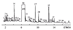 3.7 气质联用分析 取精油0.2 μL,按气质联用条件直接进样,结果见表2,总离子流图见图2。在上述条件下,从肉桂油中分得41个成分,鉴定了39个成分,占全精油的95.1%。