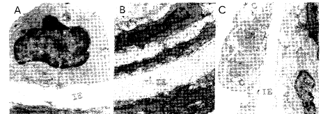 Figure 2. EM of 60 d after arcuate nucleus being damaged by MSG. Egeneration of endothelial cells could be seen and some as the endothelial cells had fallen off. The subendothelial tissue was evidently thickened with macrophges or smooth muscle cells migrated from blood and tunica media. A:× 9 000; B:× 4 800; C:× 3 000.