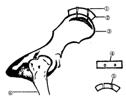 ①Titanium implant; ②Composite bone graft; ③Anterior superior iliac spine; ④Vertical view of composite bone graft; ⑤Side view of composite bone graft; ⑥Femur