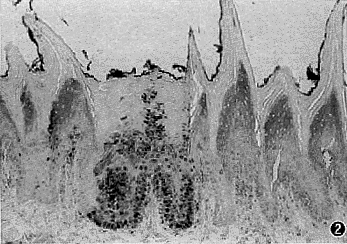 图1 DA大鼠于实验第16周发生了第1例舌癌(×) 图2 第16周DA大鼠舌粘膜内的p53阳性细胞簇(×150)