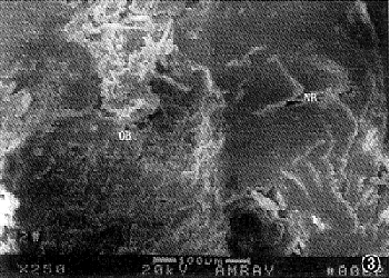 4. 扫描电镜观察:将剪切试验后的种植体与骨,按常规方法制备电镜标本。以2.5%戊二醛固定,乙醇逐级脱水,液氮致冷干燥,表面喷金,用AMRAY100B型扫描电镜观察种植体—骨界面破坏后的骨和种植体表面形貌。