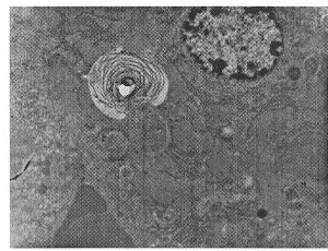 2.4 电镜下组织学变化 TPN组胞质内见有脂滴及少许 胆汁残体,毛细胆管扩张,内有髓 鞘样内容物(为胆栓),微绒毛消失。TPN+SAMe组胞质内无脂滴、残体,毛细胆管不扩张 ,内无内容物,如图4、5所示。