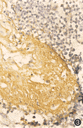 4.免疫显色半定量判定标准及统计学方法: 按显色的深度和阳性颗粒的粗细、数量分为三级,显色略高于背景、阳性颗粒细而少为弱阳性;显色为深褐色或棕褐色、颗粒粗大而多为强阳性;界于两者之间者为中度阳性。阳性颗粒在每个高倍镜视野中占30%以上定为阳性切片;其中强阳性染色占所有阳性颗粒的1/3以上为强阳性切片;每个病例连续取5张切片染色, 其中有一个阳性切片既定为阳性病例,比较阳性病例及强阳性病例在两组间的百分率的统计学差异,采用χ2检验。