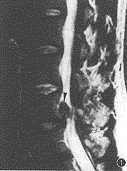 图3,4髓外硬膜下占位性病变。图3 示腰椎矢状位增强前T1WI,显示L2椎体后方卵圆形软组织肿块(箭头) 图4 MR椎管水成像显示病变(箭头)为中等信号,患侧硬膜下腔 “造影剂柱” 在病变两端变宽, 出现杯口状切迹。脊髓(箭)向健侧移位。手术证实为神经纤维瘤