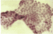 图1 示涂片丰富的细胞量及细胞排列呈乳头状结构,并见滤泡结构及中央一团致密红染的胶质,HE×20;