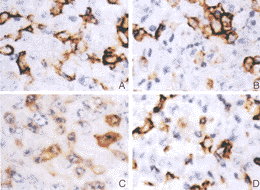 图3肺巨细胞癌移植瘤中uPA(A)、PAI-1(B)、PAI-2(C)、uPAR(D)的免疫表达,LSAB5×40