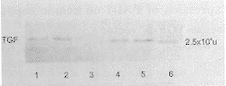 图3 Northern blot检测TGF-β1和PAI-1 mRNA表达:①SMMC 7721。②SMMC 7721细胞转染pcDNA3。③SMMC-TGF2细胞。④SMMC-TGF3细胞。⑤SMMC-TGF4细胞。⑥SMMC-ASTGF细胞。PAI-1为3.2 kb PAI-1 mRNA, TGF为2.5 kb TGF-β1 RNA, GAPDH为内参照。