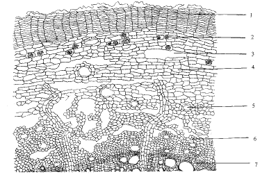 1—Phellem;2—Druse of calcium oxalate;3—Crack;4—Cortex;5—Secretoryduct;6—Pholem;7—Cambium