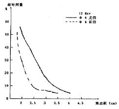 在术中放疗中,照射野外围的半影剂量直接影响到靶区周围脏器的损伤, 在使用有机玻璃材料制成的限光筒后,半影剂量有所提高,为了消除这种影响,将野外剂量降到野中心剂量的5%以下, 我们特地设计了限光筒上端的铅挡,材料为低溶点铅,密度为9.4克/cm3,当能量6~15 MeV不等,铅所需厚度约为5~8 mm左右,在铅板下端附有10 mm厚的水等效有机玻璃材料,以吸收由铅板产生的次级射线, 铅板开口和形状按相似限光筒开口制作,使每一个限光筒都有一块配套使用的铅挡,选择挡板足以消除18 MeV以下,不必要的射线,实际测量表明,使用这种屏蔽物后,周边剂量能达到要求,见图2,同时建议按上述方法浇涛几块条状挡块,以备照射中遮挡照射野内需挡的部位。之于有机玻璃板制成的限光筒产生的穿透半影和散射半影能与常规限光筒近似,故本文不作介绍。
