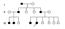 患者为第2胎足月顺产,出生后双眼无上睑下垂,8年前开始出现右眼上睑下垂,逐渐加重,近1年加重明显。检查:视力右眼0.8,左眼1.0。右眼上睑下垂完全遮盖瞳孔。肌力为“0”。新斯的明试验为阴性。追问其病史,三代内否认近亲婚配史,家庭中有7人,均在40岁以后开始患此病(如图1)先征者在局麻下行右眼提上睑肌缩短术。术中所见提上睑肌被膜光滑,提上睑肌增厚,约2mm,被黄色脂肪组织包绕,切断提上睑肌,断端可见少量的肌纤维,其余全部为脂肪组织,术后病理诊断为提上睑肌脂肪样变性。