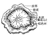 外韧式维管束,皮部白色,木部淡黄白色,有菊花心,具棕色环,皮部可见裂隙,较平滑