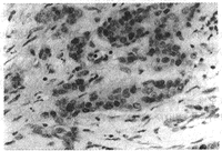 Abstract: The effect of local arterial infusion of β-elemene on breast cancer tissue inhibition and cell apoptosis and proliferation was observed. The deoxyribonucleotide and labelling method mediating by end transferase and the immunohistochemical assay for cell nucleus antigen (PCNA)were employed to observe the apoptosis index (AI),cell division index and PCNA index. The mass of breast cancer was also observed.The breast cancer samples were taken from 14 cases receiving preoperative local arterial infusion of β-elemene (the treatment group) and 17 receiving operation only (control group ). The results showed that AI in the treatment group (7.97±1.50) was higher than the control group (2.26±0.49) (P<0.01);the difference of PCNA index and division index were not significant between the treatment group (44.54±9.99, 3.92±1.44 respectively) and the control group (42.80±6.78,3.88±1.08 respectively) (P>0.05). There is negative correlation between AI and the reduction of mass in the treatment group by degree relative analysis (r=-0.508).It is concluded that preoperative local arterial infusion of β-elemene can reduce the mass and its possible mechanism is by inducing breast cancer cell apoptosis.
