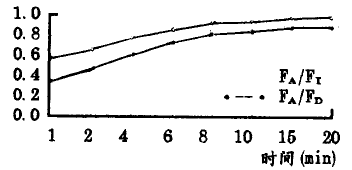 本组病人平均手术时间159分钟。在地氟醚吸入相,FI∶FD及FA∶FD=1/2的时间分别为0.63分钟和2.88分钟,FA∶FI比值迅速上升,平均4分钟即达0.7以上,并于15分钟后稳定在0.90左右。FA∶FD比值呈平行上升,很快于15分钟后维持在0.75上下(表1、图1)。停止吸入后,FA∶FAO=1/2的时间为2.45分钟,FA∶FAO比值迅速下降,11分钟后降至0.2以下(表2、图2)。