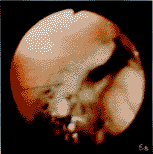 所有接受顺铂雾化吸入化疗者经观察没有发现口腔、咽颊粘膜炎,有24例接受支气管镜检查确定疗效(图4、5、6),没有发现气管、支气管粘膜损伤者。实验动物经大体及显微镜检查者亦未发现损伤性组织学改变。