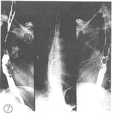 2.1 X线影像比较:每例患者在术前加速放射治疗结束后第2d及第14d分别两次摄食管钡餐造影片。由放射科、放射治疗科、胸外科3名副主任医师以上的人员读片,读片前用胶布粘住每例患者的摄片的日期,再进行“多盲法”对比观察、记录。评判标准按1981年第三届全国放射学术会议(郑州)治疗组通过的食管癌放射治疗后X线诊断标准分为4级。Ⅰ级:病变完全消失,食管壁软而光滑,蠕动及扩张良好,粘膜纹理清楚可见(图1、 2);Ⅱ级:病变基本消失,食管壁规则,钡剂能顺利通过,但管壁仍僵直或狭窄,蠕动未恢复,粘膜仍增粗(图3、 4);Ⅲ级:病变明显好转,食管病灶退缩一半以上,没有明显扭曲、成角以及突出腔外的溃疡,稠的钡剂能通过(图5、 6);Ⅳ级:病变残留或恶化,病灶消退不到一半或成角,扭曲明显或有突出腔外的溃疡,钡剂通过极差(图7、 8)。118例术前加速放射治疗后不同时间的X线影像变化结果中,从Ⅲ、Ⅳ级病例上升为Ⅱ、Ⅲ级者最多,分别达 37.8%(17/45)和43.8%(7/16);但未发现越级上升和降级病例。