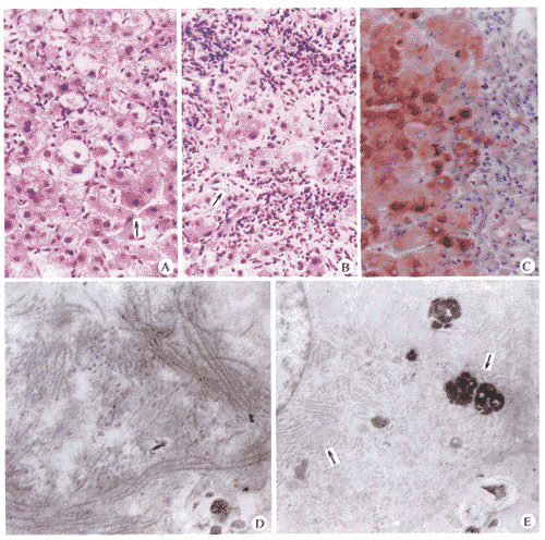 2.3.3 超薄切片的电子显微镜观察结果 肝细胞浆内线粒体嵴模糊不清,电子密度增高,散在大小不等脂滴,胞浆内次级溶酶体增多,可见空泡形成,部分肝细胞内有大量糖原颗粒肝细胞之间可见单核细胞及淋巴细胞浸润,并有大量胶原纤维形成,见图版Ⅱ,图D,E。