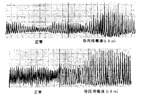 2.3 导泻排毒液对家兔离体肠平滑肌的影响(见表3,图1):实验表明,导泻排毒液能使肠管肌张力明显增加,收缩幅度增大,离体肠蠕动增强,与对照组比较有非常显著性差异(P<0.01)。