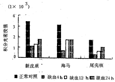 2.对照组与实验组大脑皮质、海马与尾壳核IOD的比较: 对照组分缺血4h、12h、24h三组,各组上述部位IOD与正常组间比较均有显著差异(P<0.01),见图2。